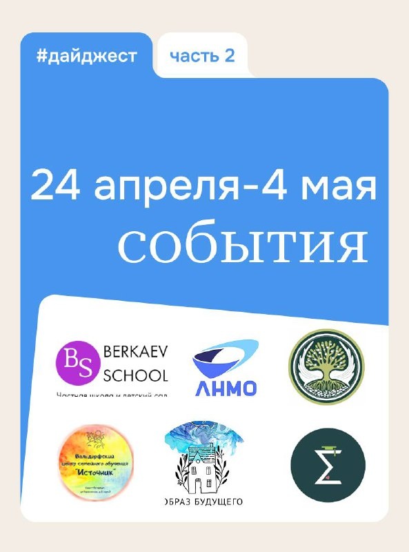 • 26 апреля Открытие филиала Средней школы в ЧОУ «АБ Школа» Berkaev School Центральный район https://vk.cc/cL0zO8 • 26 апреля 10.00 Вальдорфский центр семейного обучения «Источник» Приморский район vk.cc/cKTGO7 • 26 апреля День открытых дверей в «Школе 1-11» Кузьмолово https://vk.cc/cL3OKo • 26 апреля День открытых дверей в РКШ Соль земли Московский район https://vk.cc/cL3Pfk • 26 апреля 14.00 День открытых дверей и конкурс по биологии «Естественный отбор» в ЛНМО Адмиралтейский район https://vk.cc/cL4UN3 • 27 апреля 11.00 День открытых дверей в СИГМА.ШКОЛА Первомайское сельское поселение vk.cc/cKTGlo • 29 апреля 18.00 День открытых дверей в Центре поддержки семейного образования «Образ Будущего» Юкки https://vk.cc/cL3PpC Ещё больше мероприятий в Календаре событий на нашем сайте.