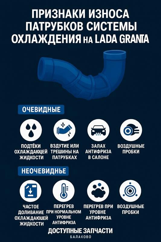 🔧 Патрубки системы охлаждения на Лада Гранта — когда пора менять? 📍 г. Балаково, Транспортная 6, корп. 2 📞 +7 (917) 212-81-14 Подпишись на наш канал, чтобы не пропускать полезные советы и новинки автозапчастей! ⸻ 💥 Многие водители думают, что патрубки нужно менять только при явной течи. Но на самом деле износ начинается намного раньше — и его можно заметить, если знать ключевые признаки. Особенно это актуально для владельцев Лада Гранта. 🔎 Очевидные признаки: — Видимые трещины или вздутия на поверхности — Течь антифриза в районе соединений — Снижение уровня ОЖ при исправной системе — Сильный запах тосола под капотом 🧠 Неочевидные признаки: ✅ Потеря эластичности — попробуйте сжать патрубок рукой: если он «дубовый» или хрустит — это сигнал. ✅ Масляный налёт — появление жирного слоя на патрубке указывает на старение резины и возможную микропротечку. ✅ Нестабильная температура двигателя — перегрев может быть связан с частичным пережатием или засором изнутри. ✅ Химический запа