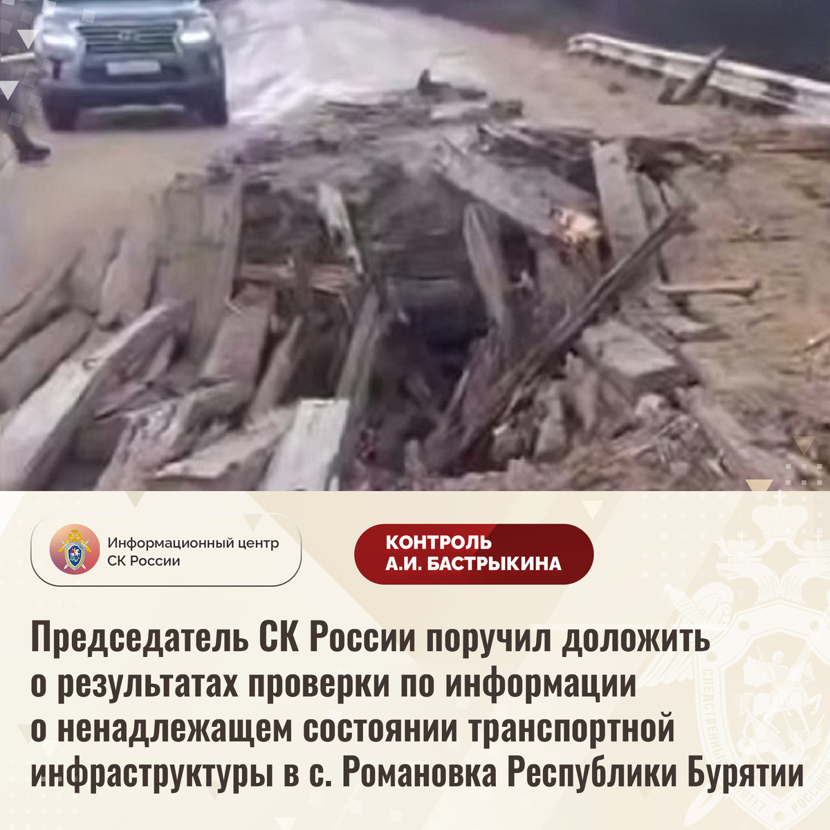 Председатель СК России поручил доложить о результатах проверки по информации о ненадлежащем состоянии транспортной инфраструктуры в с. Романовка Республики Бурятии В СМИ и социальной сети сообщается, что в селе Романовка Республики Бурятии единственный мост, соединяющий село с другими населенными пунктами, длительное время находился в аварийном состоянии и в апреле текущего года был разрушен. Альтернативная объездная дорога требует пересечения реки вброд, что небезопасно. Несмотря на многочисленные обращения местных жителей, меры к проведению ремонтных работ социально значимого объекта не принимаются. В СУ СК России по Республике Бурятии по данному факту организована процессуальная проверка. Председатель Следственного комитета Российской Федерации Александр Иванович Бастрыкин поручил руководителю СУ СК России по Республике Бурятии Евгению Вячеславовичу Лагацкому доложить о предварительных и окончательных результатах процессуальной проверки, поставив ее на контроль в центральном аппарат
