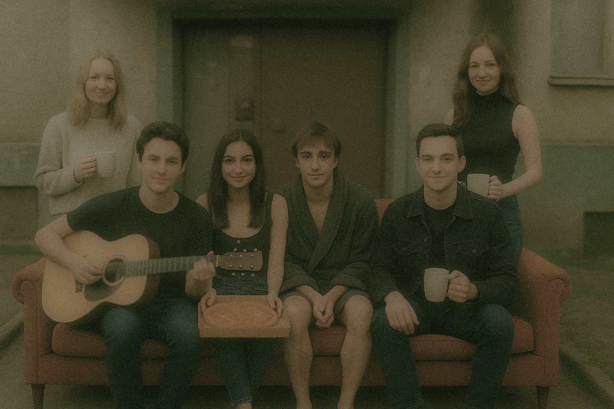 Шестеро друзей — таких, что вместе пережили и первую любовь, и первую сессию, и первый ремонт в подъезде — однажды решили: а почему бы не сделать свою собственную «заставку» к сериалу про себя? Не про Нью-Йорк, а про Пушкин. Не про кофейню, а про свой двор, где каждый знает, кто когда выгуливает собаку, а голуби давно считают их частью местного пейзажа. Они выбрали для художника самую честную фотографию: все на старом диване у подъезда, который когда-то кто-то притащил «на время», а теперь он стал их штабом. Двое держат кофе в пластиковых стаканах, один обнимает гитару, у кого-то на коленях пицца, а один — в халате, потому что пятница, потому что можно. На стене за спиной — надпись: «Не кормите голубей!» (но все знают, что кормят, и голуби это знают тоже). — Сделайте, как в Friends, — попросили они художника. — Только пусть вместо фонтана будет наша лужа, вместо Нью-Йорка — родной двор, и чтобы свет был такой же тёплый, как наш смех, когда мы собираемся вместе. Арт-дизайнер подошёл к з