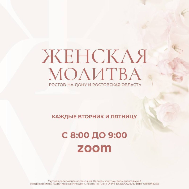Дорогие сестры!🌸 Напоминаем, что продолжается женская молитва по вторникам и пятницам.🙏🏻 В эту пятницу за ваши нужды будут молиться: 🌺 Лидеры церкви «Христианская миссия» г.Ростов-на-Дону- Талошная Новелла и Карташова Наталья Если у вас есть просьбы или переживания, вы можете оставить их анонимно через бот⬇️ https://t.me/molitva_chm_rnd_bot Не забывайте, важно сделать это до 21:00 сегодня.