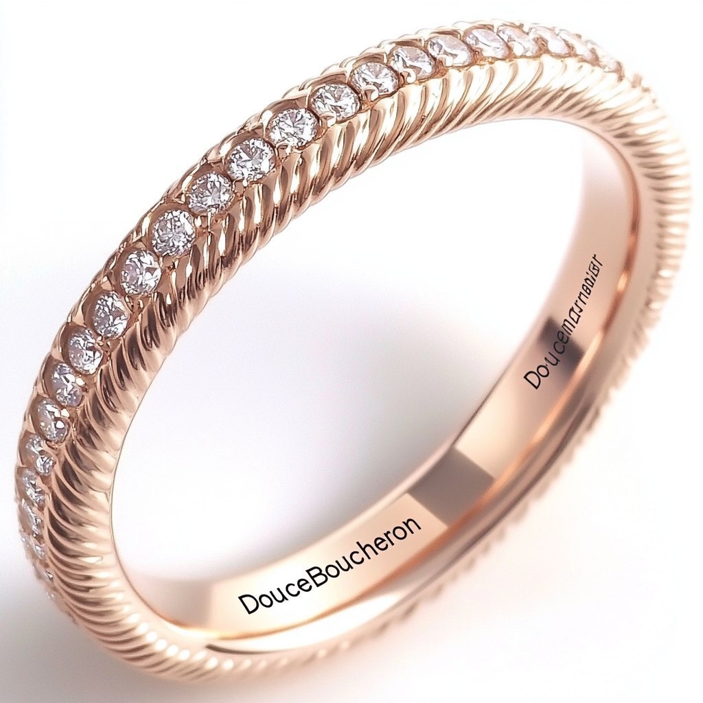 Создано на основе запроса: The rose gold wedding band is designed with the "Boucheron" logo, set in diamonds on one side of its edge and a row made from thin rope-like ribbons that go around it all over the ring, creating an elegant design. The entire ring has a very smooth surface. It was created in the style of Bivek Goldin for Chanel's new collection called "Douceur". This design adds luxury to your fingers on a white background. --- Автоперевод: Обручальный кольцо из розового золота разработан с логотипом "Boucheron", установленным в бриллиантах на одной стороне его края, и рядом с тонкими веревными лентами, которые обоходят его по всему кольцу, создавая элегантный дизайн. Как тебе картинка? 🤔 https://dzen.ru/id/65c0c65c86e4f837c27b24d7 #ИИ #AI #нейросеть #midjourney #art