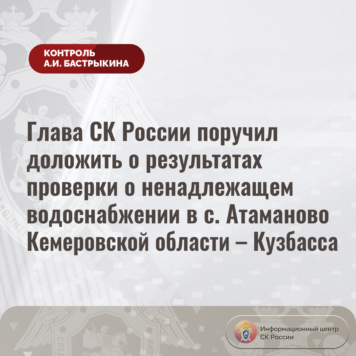 Глава СК России поручил доложить о результатах проверки о ненадлежащем водоснабжении в с. Атаманово Кемеровской области – Кузбасса В социальной сети сообщается, что в селе Атаманово Кемеровской области – Кузбасса отсутствует централизованное водоснабжение, при этом техническая вода в пробуренных скважинах непригодна для питья и бытовых нужд. Несмотря на многочисленные обращения местных жителей, меры к разрешению проблемы не принимаются, подвоз жизненно необходимого ресурса не организован. В СУ СК России по Кемеровской области – Кузбассу по данному факту организована процессуальная проверка. Председатель Следственного комитета Российской Федерации Александр Иванович Бастрыкин поручил руководителю СУ СК России по Кемеровской области – Кузбассу Александру Сергеевичу Безукладникову доложить о промежуточных результатах процессуальной проверки и принятом по итогам решении. Исполнение поручения, а также ход процессуальной проверки поставлены на контроль в центральном аппарате ведомства. #Сле