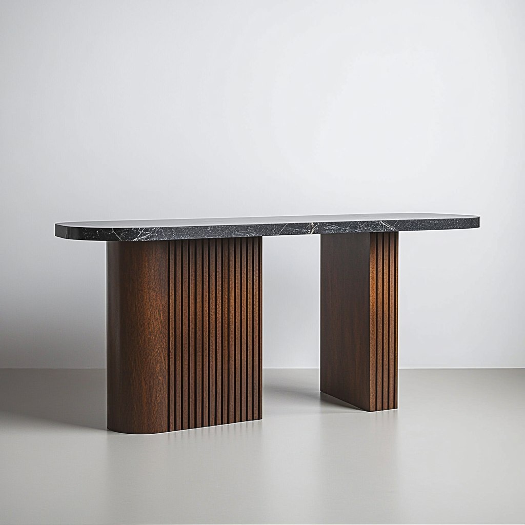 Создано на основе запроса: reeded mahogany wood island counter with black marble top, white background studio shoot, minimalist, simple, smooth, modern, designer luxe