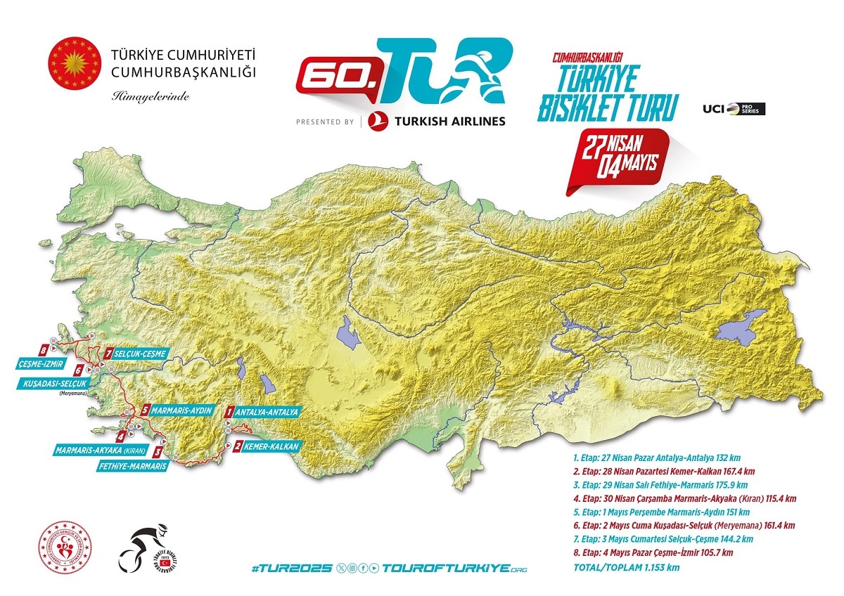Опубликован маршрут многодневной шоссейной велогонки Тур Турции 2025 года. Это этап ПроСерии UCI 2025 в категории 2.Pro. Гонка пройдет с 27 апреля по 4 мая. Как и в предыдущие годы, трасса будет интересной для спринтеров, и именно среди «быстрых ног» может быть определен победитель. Старт запланирован в Анталии, как и в 2024 году. Но в этот раз финиш будет в Измире, а не в Стамбуле. В программе восемь этапов, среди которых особенно важны третий, четвертый и шестой. На третьем этапе гонщики столкнутся с подъемами, которые могут преподнести сюрпризы. Четвертый этап пройдет через деревню Акьяка (Кыран), а шестой — через Сельчук (Мерьемана). Эти участки также обещают быть напряженными. Этап 1 (27апреля): Antalya – Antalya (132 км) Этап 2 (28апреля): Kemer – Kalkan (167,4 км) Этап 3 (29апреля): Fethiye – Marmaris (175,9 км) Этап 4 (30апреля): Marmaris – Akyaka (Kıran) (115,4 км) Этап 5 (01мая): Marmaris – Aydın (151 км) Этап 6 (02мая): Kuşadası – Selçuk (Meryemana) (161,4 км) Этап 7 (03мая)