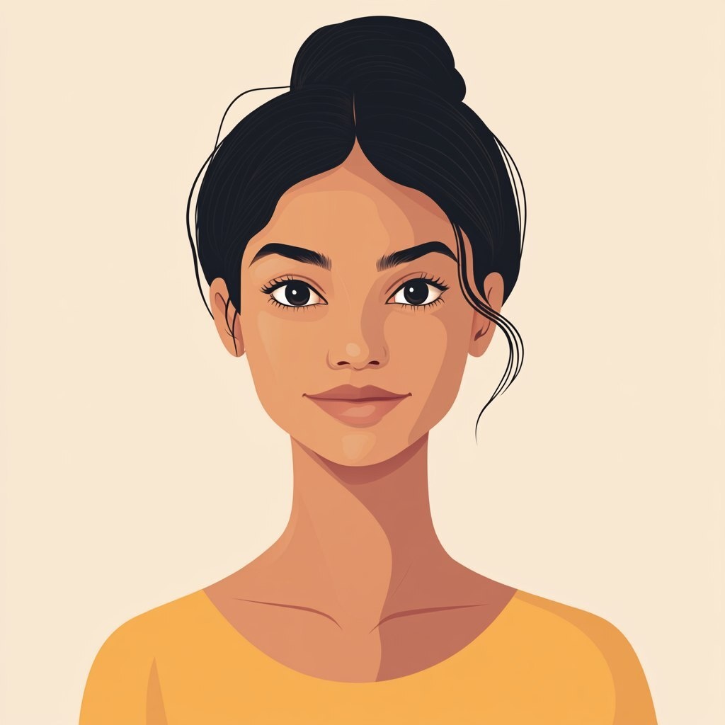 Создано на основе запроса: Generate a detailed vector Illustration of a mid-aged woman looking happy with a subtle smile, looking straight. Front view of the mid-aged woman illustration. She has medium to fair skin, soft facial features, and natural light makeup. Her hair is black, neatly tied into a low bun with subtle waves and highlights, and a few loose strands. The background is a plain, light beige. The illustration should be in a clean, modern vector art style with soft shadows, warm natural tones, and visible line details, resembling digital hand-drawn techniques. The mid-aged woman wears a simple mustard yellow top. --- Автоперевод: Создайте подробную векторную иллюстрацию женщины среднего возраста, которая выглядит счастливой с тонкой улыбкой, выглядящей прямо. Как тебе такая картинка? 🤔 https://dzen.ru/id/65c0c65c86e4f837c27b24d7 #ИИ #AI #нейросеть #midjourney #art