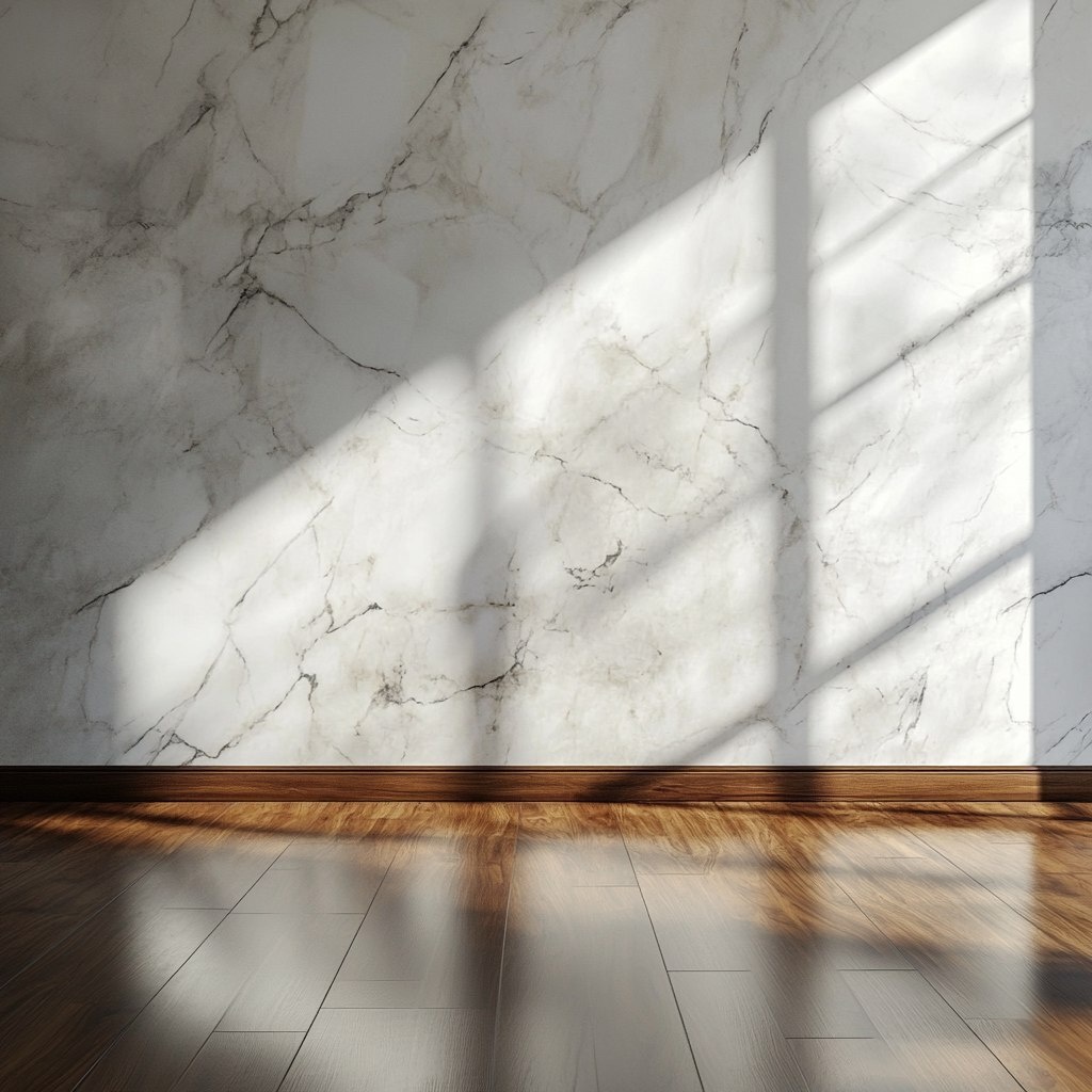 Создано на основе запроса: empty room, white marble wall, mahogany wood floor