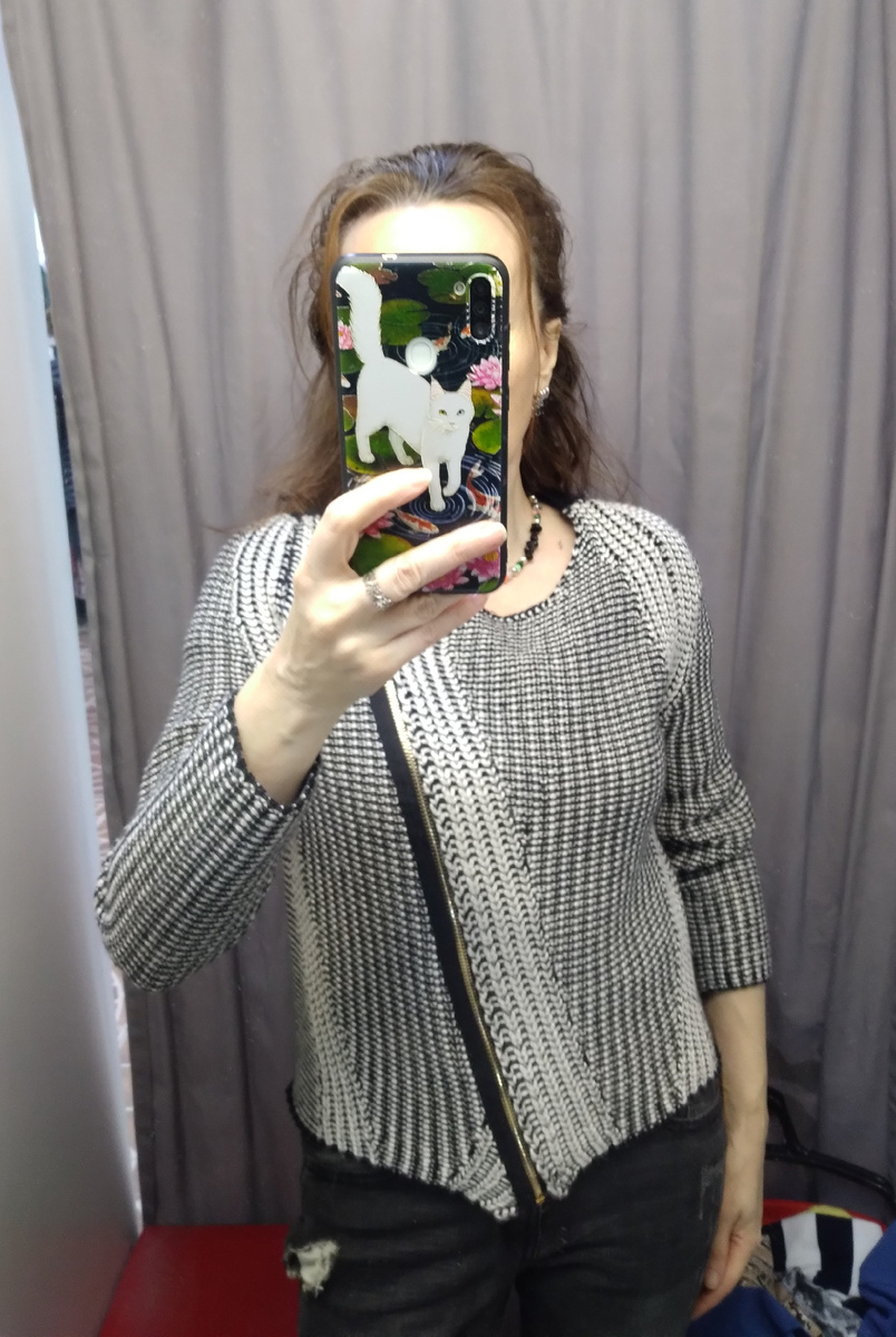 Серый кардиган с молнией наискосок и трикотаж наискосок, нечто необычное. Только жаль, что рукава короткие, возможно они рассчитаны как 3/4, а на мой рост они ни туда ни сюда.