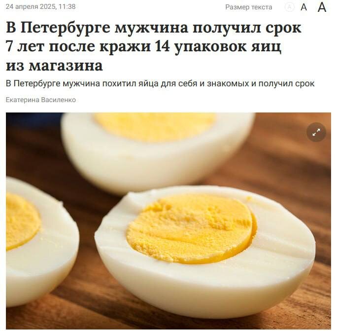 В Петербурге суд приговорил мужчину к 7,7 годам колонии за кражу куриных яиц. Он похитил из магазина 14 упаковок, часть украденного он съел сам, остальное — подарил знакомым. Таким образом, он проведёт в заключении почти три недели за каждое украденное яйцо. Суровость наказания объясняется тем, что ранее мужчина уже был неоднократно судим 👉🏻Новости №1 в Ростове 💌Прислать новость/фото