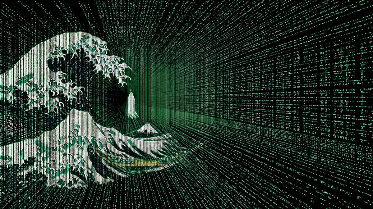 Создано на основе запроса: a great tempest storm wave with digital rain coming down, in the style of Hokusi and the matrix --- Автоперевод: Отличная буря штормовая волна с цифровым дождем, в стиле Хокусаи и Матрицы Какое твое впечатление? 🤔 https://dzen.ru/id/65c0c65c86e4f837c27b24d7 #ИИ #AI #нейросеть #midjourney #art