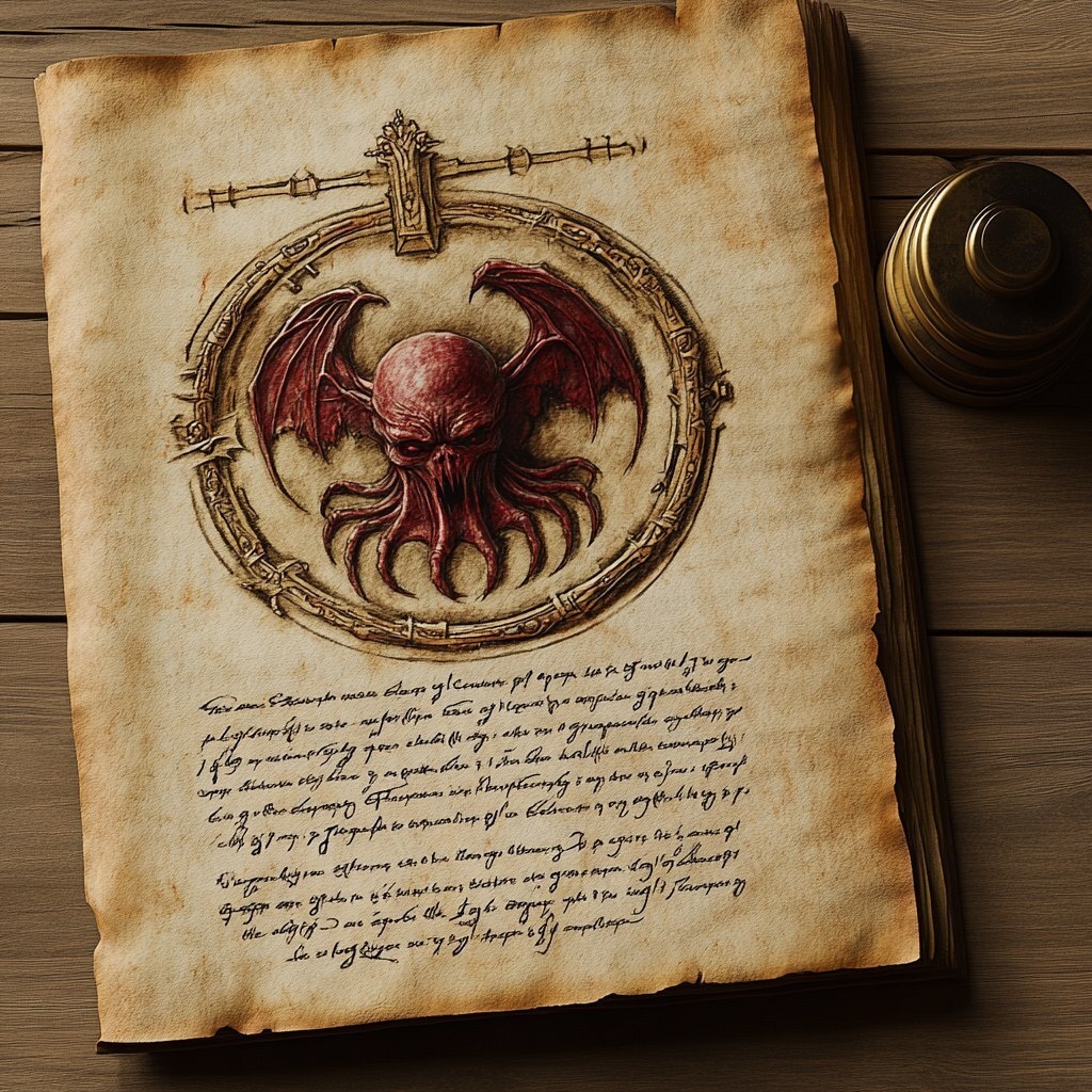 Создано на основе запроса: medieval manuscript page, illuminated letter, aged parchment, handwritten Latin text, dark ink, Lovecraftian