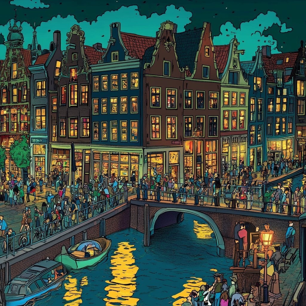 Создано на основе запроса: amsterdam in crazy adult cartoon style, showing canals, lots of people and red light district
