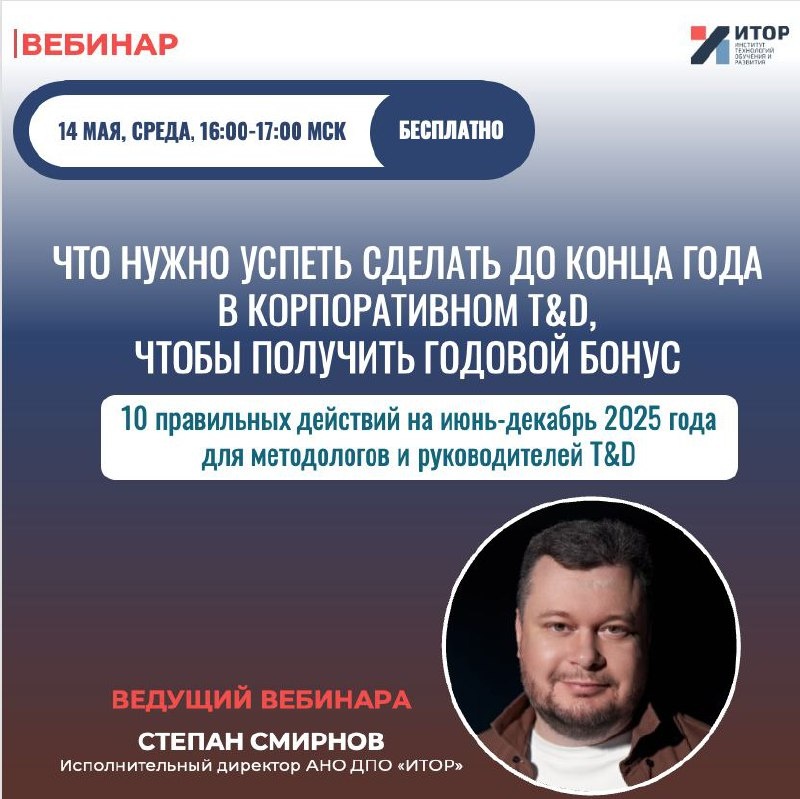 Вебинар «Что нужно успеть сделать до конца года в корпоративном T&D, чтобы получить годовой бонус» ВЕДУЩИЙ Степан Смирнов, исполнительный директор ИТОР, эксперт с 12-летним опытом в HR и T&D, реализовавший проекты в Росатоме, IKEA, Новатэке и других крупных компаниях. КОГДА 14 мая, 16:00–17:00 (МСК) Хотите узнать, какие 10 ключевых шагов помогут методологам и руководителям T&D успешно завершить год и получить заслуженный бонус? Год стремительно набирает обороты — апрель почти позади, и самое время подумать, как эффективно использовать оставшиеся месяцы. На нашем мастер-классе мы расскажем не только о ключевых шагах для успешного завершения года в корпоративном T&D, но и подробно познакомим вас с четырьмя новыми методическими школами-практикумами. Эти школы созданы, чтобы помочь вам системно развиваться, применять лучшие практики и достигать заметных результатов. Кроме того на мастер-классе вы: ✔ Получите четкий план действий на июнь–декабрь 2025 года ✔ Поймёте секреты результатив