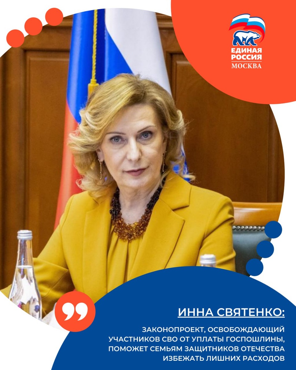 💙Инна Святенко: Законопроект, освобождающий участников СВО от уплаты госпошлины, поможет семьям защитников Отечества избежать лишних расходов. 💙Эта инициатива была предметом обсуждения на встречах в штабах общественной поддержки «Единой России». Инна Святенко подчеркнула, что участники СВО и их семьи, сталкивающиеся с необходимостью установления юридически значимых фактов в суде (например, установление родственных отношений, признание отцовства или принятие наследства), не должны испытывать финансовую нагрузку. 📝«В Совете Федерации в рамках деятельности рабочей группы по законодательному обеспечению прав и интересов участников СВО и членов их семей мы вышли с законодательной инициативой освободить вышеуказанные лица от уплаты государственной пошлины при обращении в суд с заявлениями о рассмотрении дел об установлении фактов, имеющих юридическое значение, а также дел о признании гражданина безвестно отсутствующим или объявления гражданина умершим. Государство должно и может взять ф