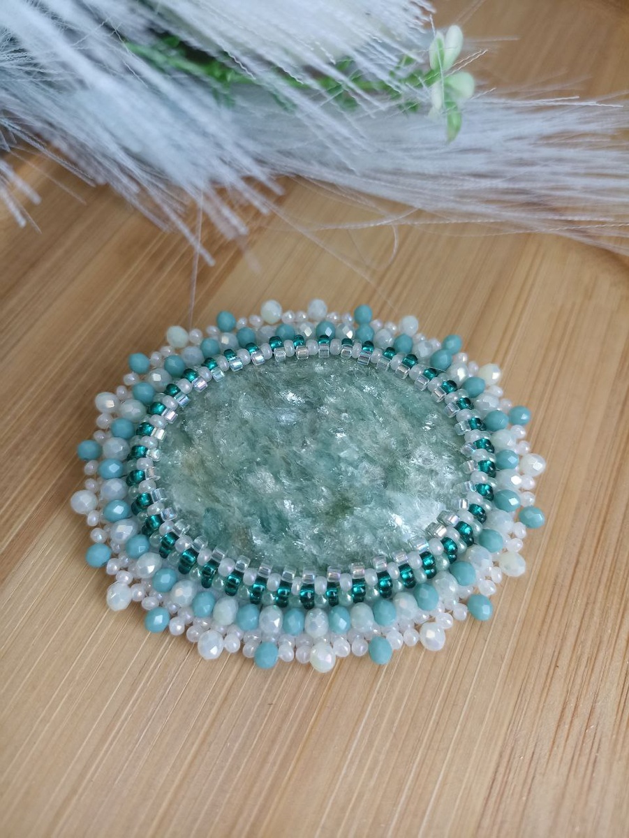 Брошь. Парагонит, бисер, вышивка. Изнанка натуральная кожа.