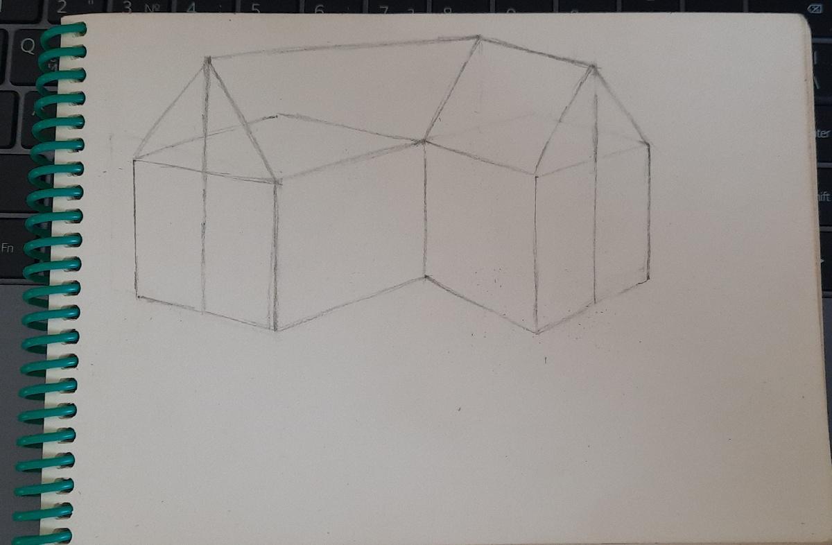 Хочу начать с того, что это первый урок, от которого я действительно получил огромное удовольствие от результата. Хоть задание и было выполнено с третьего раза, сначала дом не в том месте нарисовал, не хватило места, потом обнаружил пятно на листе. Но в итоге результат меня порадовал. Сначала рисуем дом, как в прошлом уроке, а потом пририсовываем к нему слева еще дом. Потом намечаем окна, входную дверь, дверь гаража и линии для кровли. И на этом этапе я отложил рисунок, а позже увидел мокрое пятно. Поэтому я перерисовал его снова, но как мне кажется получилось лучше. Более правильнее что-ли. Далее накидываем текстуры и глубину окон и дверей Далее мне нравится делать контур более жестким карандашом. Я использую для этого жесткость Н, а наброски делаю карандашом мягче 2В.