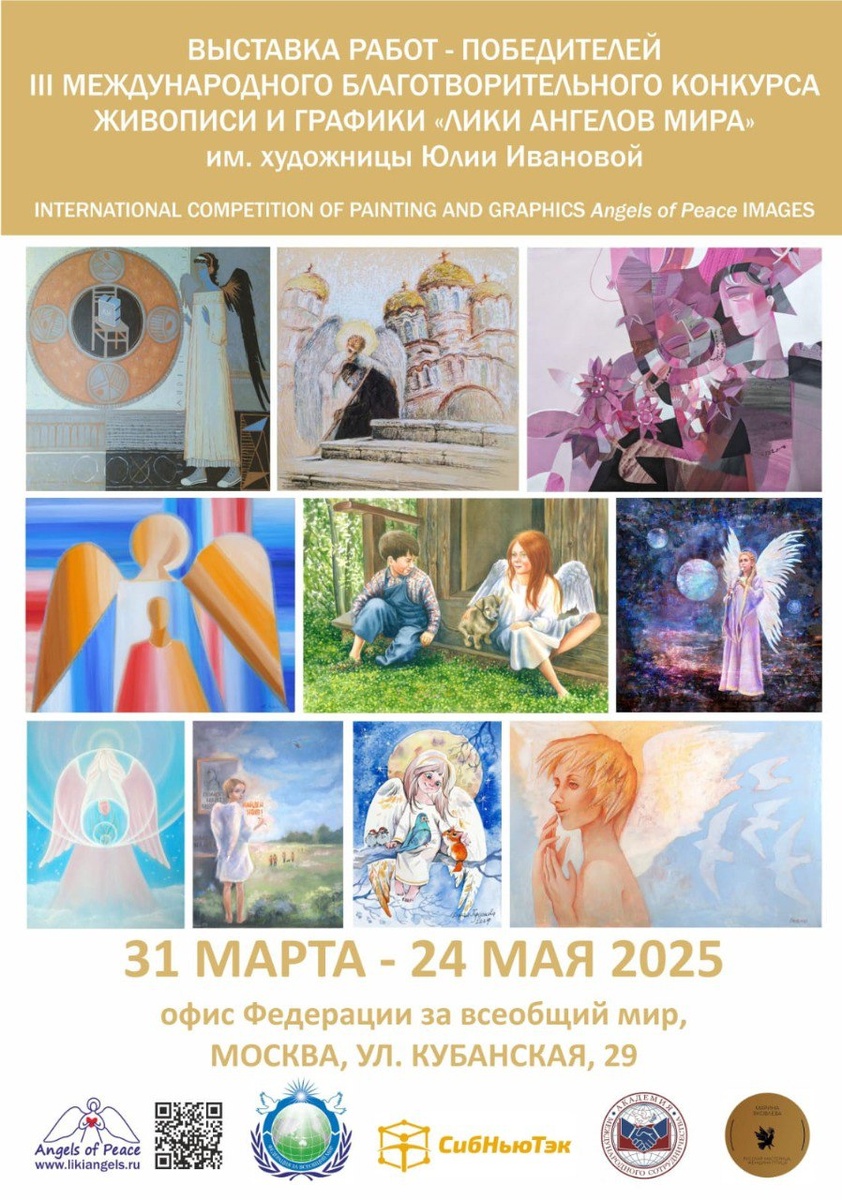 Выставка постеров "Лики Ангелов" в Москве В Московском офисе Федерации за всеобщий мир проходит вдохновляющая выставка постеров "Лики Ангелов" — часть Международного арт-проекта «Ангелы мира», который объединяет художников со всего мира вокруг образов света, добра и надежды. Проект проходит при поддержке и в рамках деятельности Ассоциации работников культуры и искусства за мир, способствуя культурному диалогу и развитию международного художественного сотрудничества. Выставка открыта для всех желающих до 24 мая, ежедневно с 10:00 до 19:00. Вход свободный. 📍 Адрес: Москва, ул. Кубанская, д. 29, Федерация за всеобщий мир Кураторы выставки — Официальный представитель Арт-проекта Яковлева Марина. Приходите прикоснуться к миру красоты, вдохновения и ангельской доброты! 🌟👼🎨