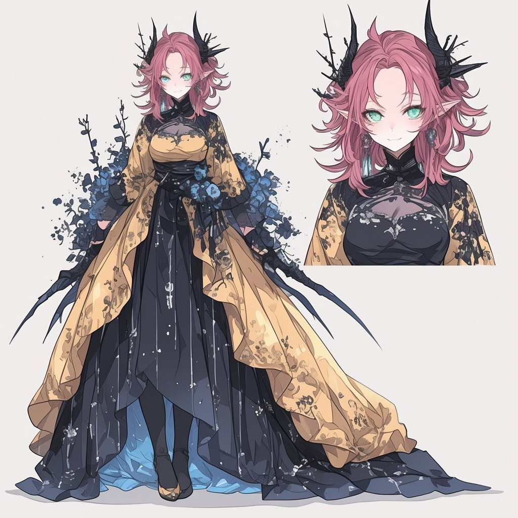 Создано на основе запроса: Full-length vampire girl with pale pink hair and green eyes in a luxurious bright dress