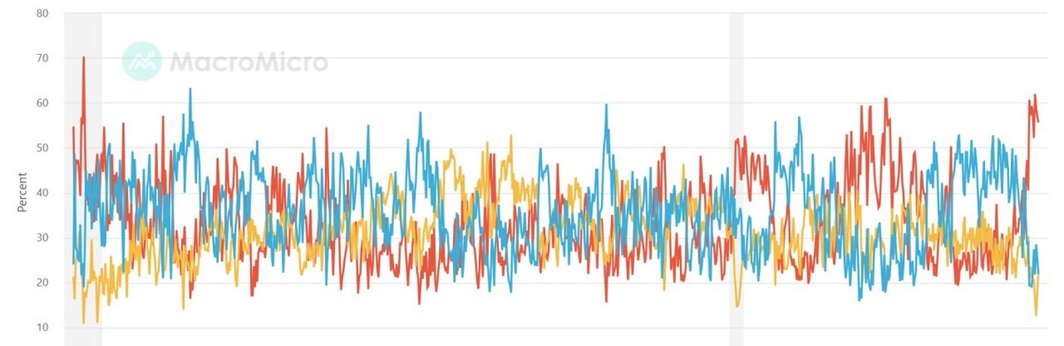 Пессимизм в США продолжается Опросы 60 000 инвесторов В чём риск для России Индикатор настроения AAII (Американская ассоциация индивидуальных инвесторов) помогает оценить общее настроение инвесторов на фондовом рынке. 60 000 членов ассоциации принимают участие в опросе. Еженедельно, по четвергам публикуют результат опроса в % Данные за 24 апреля 25г Bearish, Красный график, 55.6% Neutral, Коричневый график, 22.5% Bullish, Голубой график, 21.9% Более 60% были настроены по медвежьему 5 марта 2009г. (был разворот медвежьего тренда), в 2022 году (около 60 было 3 раза: в апреле, в июне и в сентябре) Интересно, когда медвежье настроение уменьшается с максимума. Но в 2022г было много нейтральных настроений. Сейчас, как и в 2009г. медведей в 2,5 раза больше, чем быков Необычно, что медвежье настроение (около 60%) длится уже с 27 февраля, аж 1,5 месяца. Видна двойная вершина по красному графику. Для России, если в США будут проблемы в экономике, то риск падения цены нефти.