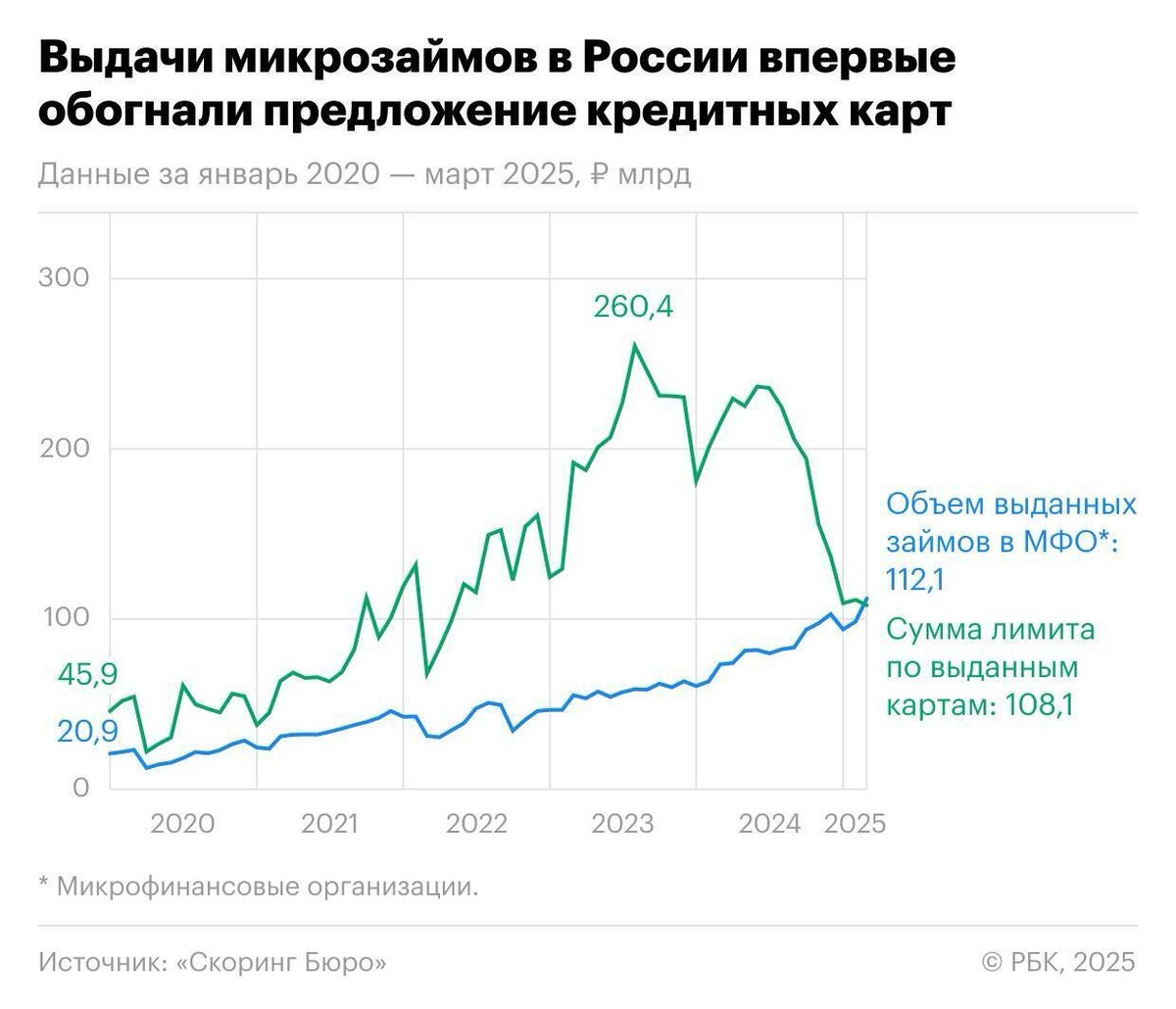 Россияне впервые заняли больше денег в МФО, чем по кредиткам. В марте 2025 года выдачи микрозаймов в России впервые за всё время наблюдений превысили предложение кредитных карт, следует из статистики Скоринг Бюро. МФО оказались менее чувствительны к жёстким мерам ЦБ, чем банки, а заемщики перестали бояться дорогих займов.