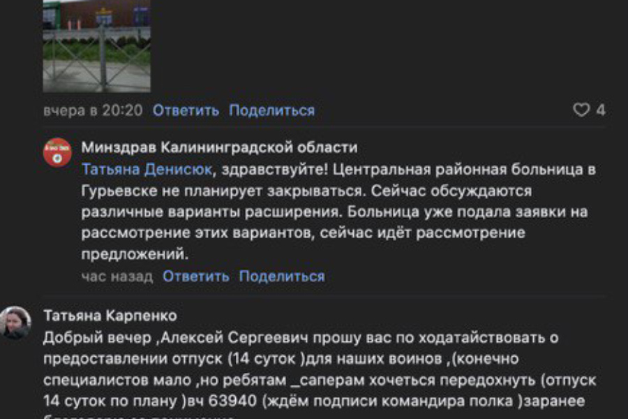 В Гурьевске намерены расширить центральную районную больницу. Об этом сообщило министерство здравоохранения Калининградской области в комментариях на странице губернатора Алексея Беспрозванных «ВКонтакте». Жительница муниципалитета рассказала о том, что «неправильная ситуация с дневным стационаром произошла», и это «навевает на мысль об очередном решении закрыть больницу». Она задалась вопросом, что мешает пристроить к зданию лечебницы новый корпус, как это сделали с отделением офтальмологии в КОКБ. Она привела также пример, как быстро появляются алкомаркеты и вейп-шопы. Для этого, утверждает жительницы Гурьевска, «участки земли находятся, а вот под больницу нет». «Центральная районная больница в Гурьевске не планирует закрываться. Сейчас обсуждаются различные варианты расширения. Больница уже подала заявки на рассмотрение этих вариантов, сейчас идёт рассмотрение предложений», — говорится в сообщении минздрава. Изображение: скриншот комментариев на странице губернатора Калининградской