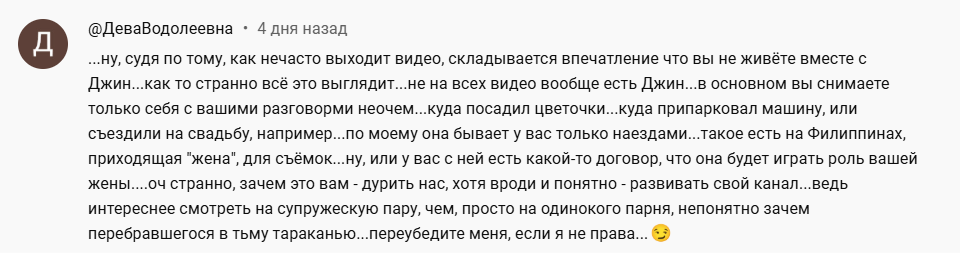 Свершилось! Разоблачение века! Оказывается, Джин — «приходящая жена» и нужна мне только для съёмок. Именно такой комментарий появился под нашим видео. Честно говоря, я растерян и даже не знаю, с чего начать свой рассказ. Вот скриншот этого комментария — чтобы никто не сказал, что я его выдумал. Отвечаю на ваш комментарий. Да, Джин действительно редко появляется в кадре. Но на то есть причины. Во-первых, она сама попросила снимать её как можно реже. Джин стесняется камеры, особенно если съёмка происходит неожиданно. Я просто исполняю её просьбу. Иногда у неё бывает настроение и тогда она сама что-то снимает и говорит в кадре. Это всегда по желанию, а не по указке. Во-вторых, у нас разный график. Я чаще снимаю днём, а она в это время спит после ночной смены. Поэтому я не жду, пока она проснётся, и снимаю один.