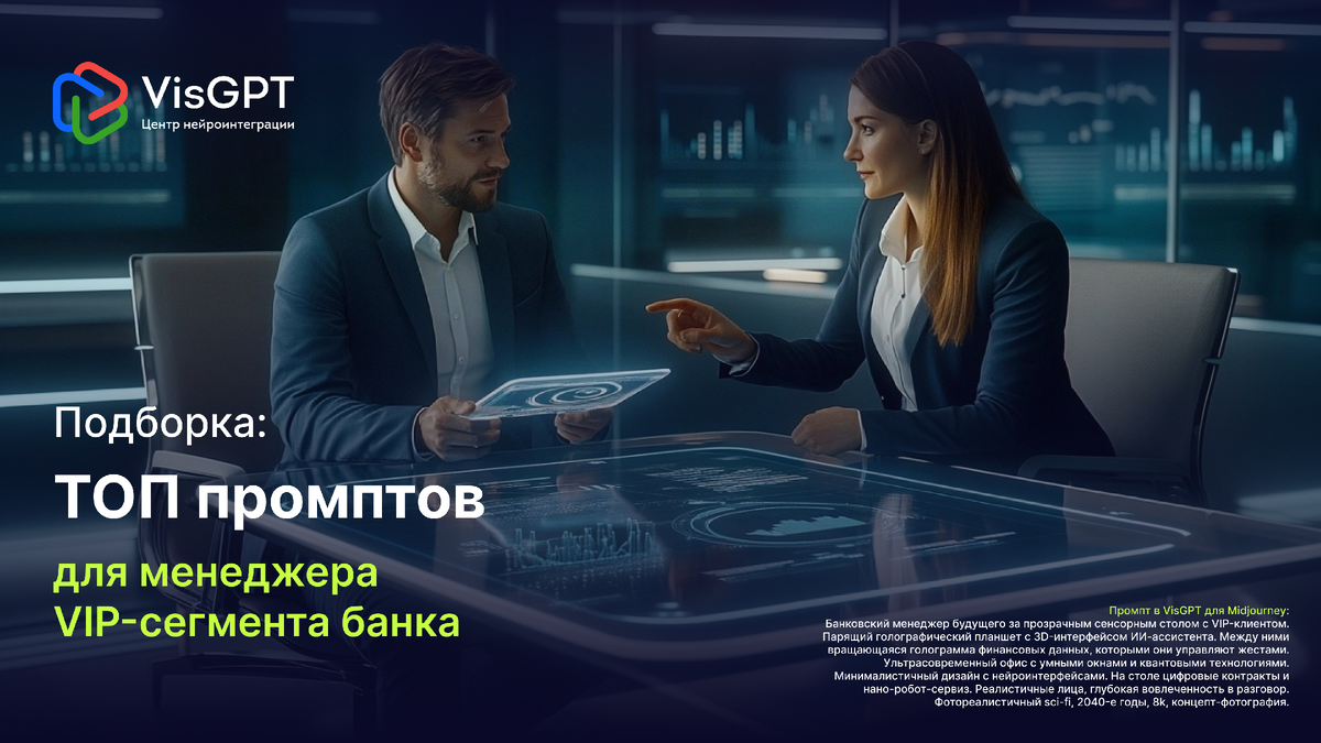 🔥 Просто скопируйте любой из промптов из нашей подборки и вставьте его в VisGPT — российский генеративный искусственный интеллект с доступом к более чем 40 передовым нейросетям, оптимизированным для бизнес-задач.
