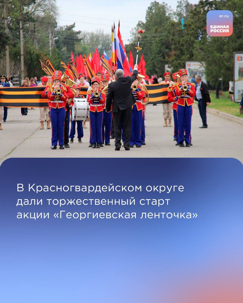 По инициативе местного отделения партии «Единая Россия» в селе Красногвардейском прошло торжественное шествие в рамках Всероссийской акции «Георгиевская ленточка». Оно стало частью масштабных мероприятий к 80-летию Великой Победы. В событии приняли участие представители трудовых коллективов, общественных организаций, партийные активисты и молодёжь. Торжественная колонна, несущая 10-метровое чёрно-оранжевое полотно – символ воинской доблести и славы – проследовала под аккомпанемент духового оркестра по центральной улице села к мемориальному комплексу. Там состоялся памятный митинг, в ходе которого прозвучали речи о значимости сохранения исторической памяти и благодарности защитникам Отечества. По окончании митинга и церемонии возложения цветов к монументу участники мероприятия могли угоститься полевой кашей и горячим чаем. Партийные активисты раздавали прохожим главный символ грядущего праздника.