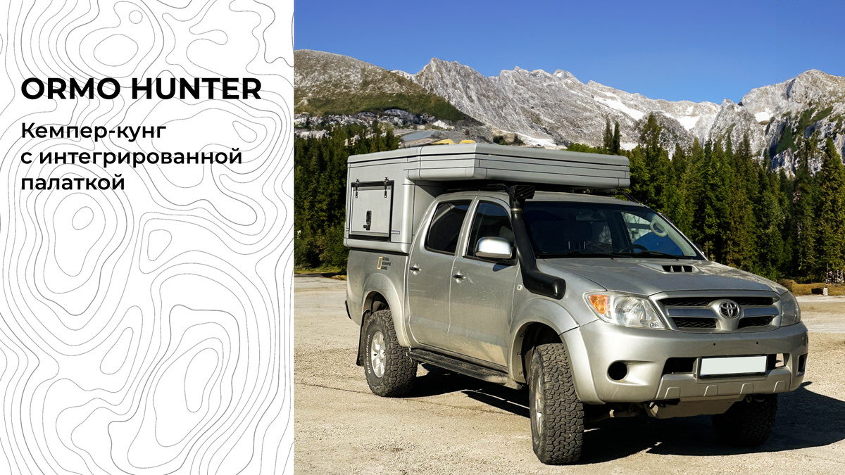 Новинка, которую мы активно готовим к запуску — серия Hunter. Сейчас вы видите прототип. Финальный вариант будет отличаться по деталям, но сутью концепции хочется поделится уже сейчас. Это кемпер-кунг с интегрированной палаткой — решение, которое в мире называют canopy camper. Это самый доступный и лёгкий жилой модуль в нашей линейке. Вес кемпера Hunter S — всего около 150 кг. Подойдёт тем, кто ценит мобильность и лёгкость —путешественникам, охотникам, рыбакам. Hunter устанавливается на кузов пикапа. Сверху — спальный альков с матрасом размером 1.5 × 2.0 метра на котором с комфортом могут разместиться два взрослых человека. Важно отметить: крыша кемпера выполнена с ножничным подъёмным механизмом. Это решение позволяет увеличить внутреннее пространство в алькове — как раз в зоне сна. Таким образом мы компенсируем компактную высоту самого кемпера и создаём полноценное и удобное спальное место. Это важная особенность серии Hunter — ведь несмотря на внешнюю компактность, внутри вам будет к