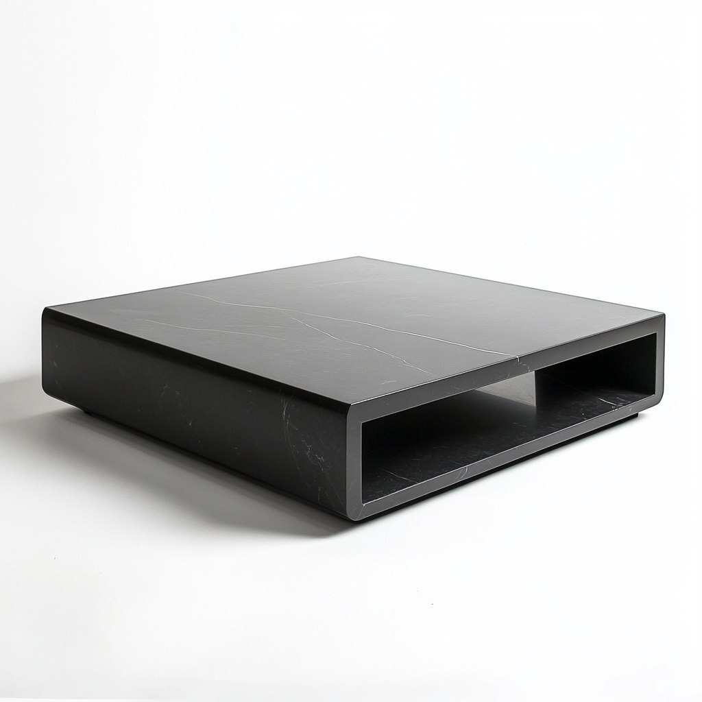 Создано на основе запроса: black coffee table., large square, min imalist modern luxe, leg base flipping over the edges of the top, white