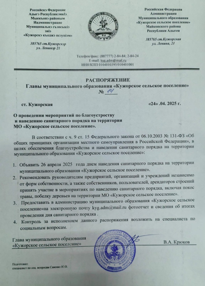Уважаемые жители, 26 апреля 2025 года проводится Всероссийский субботник🌱 Призываем всех жителей организовать уборку во дворах и прилегающих территориях. На территории парка ст. Кужорской в 9:00 запланирована побелка деревьев. Приглашаем всех жителей, организации и учреждения принять участие в мероприятии!