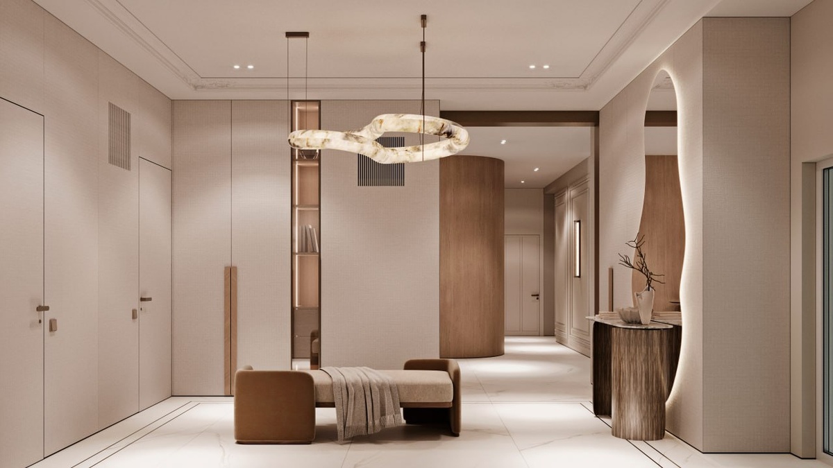 ⭐️Новый дизайн-проект PDhome, где каждая деталь работает на образ Квартира 500 м². Стиль — неоклассика. Начнём с прихожей – первого пространства, которое встречает и настраивает на атмосферу всего дома. Здесь мы создали выразительную П-образную композицию: стены и шкафы «одеты» в декоративные панели Cleaf с тканевым покрытием. Такое решение не только визуально выделяет входную зону, но и скрывает всё лишнее – от вентканалов до встроенного хранения. Чтобы конструкция не казалась тяжёлой, мы разграничили её стеклянными витринами и латунными вставками. Это добавило лёгкости и деликатного блеска✨ 💡Особое внимание – дверям. Из-за несущих стен мы не могли поднять проёмы, но нашли нестандартное решение: добавили доборы до потолка. При высоте 3 метра это визуально вытянуло пространство, сохранив архитектурную логику. Полукруглый угол прихожей мы подчеркнули шпонированными обоями – дерево привнесло тепло и тактильную глубину, а форма поддержала плавность всей композиции. Впереди ещё мног
