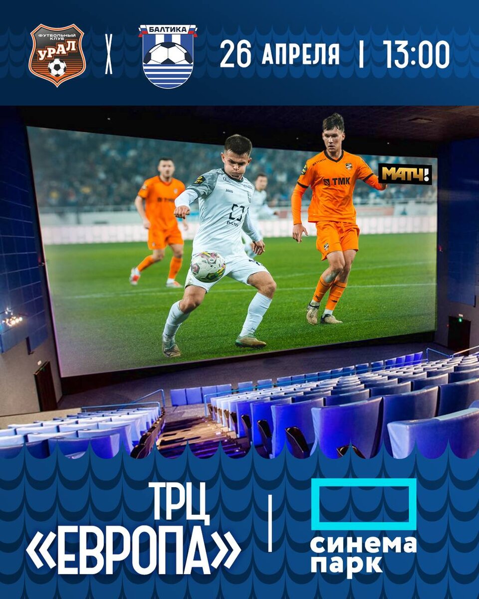 🤩 СМОТРИМ МАТЧ БАЛТИЙЦЕВ В КИНОТЕАТРЕ! В субботу бело-синие встретятся с «Уралом», и ты сможешь увидеть игру в особенной атмосфере — на огромном экране «Синема парка» в центре Калининграда! 😎 Зови родных, друзей, приходи с компанией и поддерживай любимую команду вместе с другими болельщиками! 📆 26 апреля ⏰ Начало в 13:00 (КГД) 🎟️ Билеты 📍 ТРЦ «Европа», 3 этаж