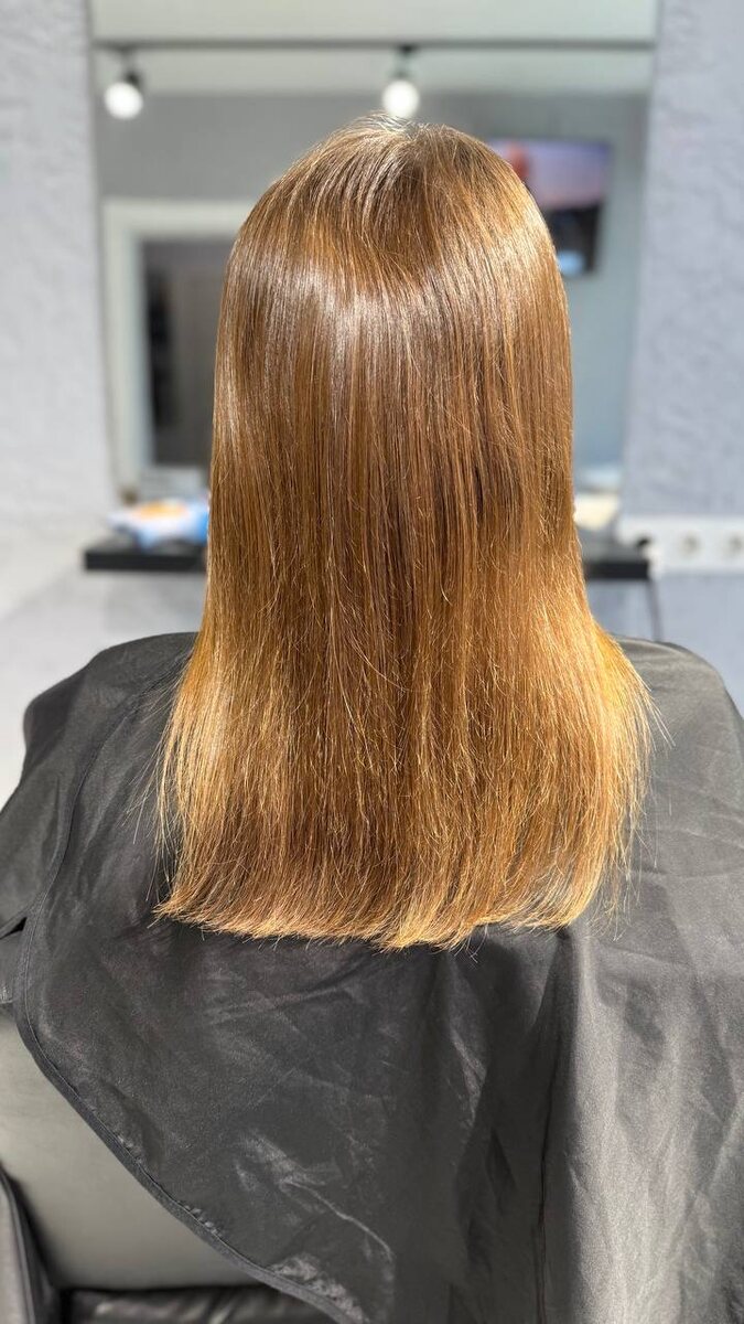 С Маргаритой работаю с сентября 2020г Фото исходника не сохранилось, к сожалению За это 4.5 года были и осветления и челки 🙂 Сейчас волосы полностью натуральные Встречаемся раз в 5 месяцев Отрастают кудрявые корни, по длине еще есть обломанные волосы, видно елку, сращиваем Кератиновое выпрямление по всей длине