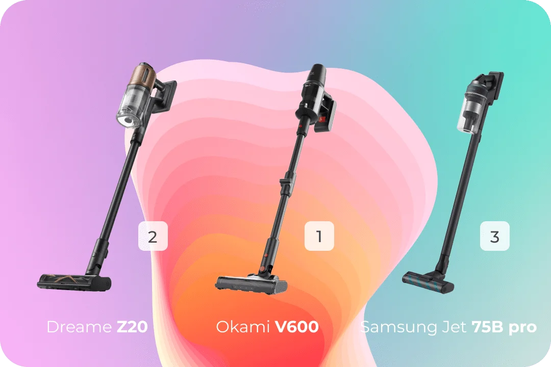 На первом месте рейтинга — лидер по мощности двигателя (650 Вт) и времени уборки, Okami V600. Этот беспроводной вертикальный пылесос убирает мусор с тягой 34 000 Па, ему по плечу и ковёр, и паркет.
