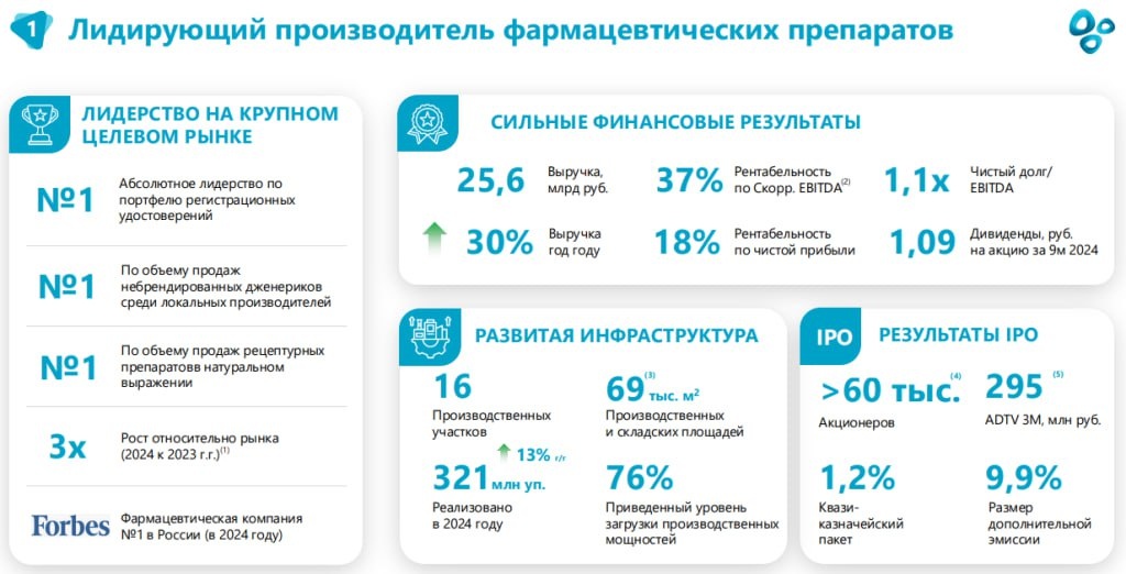 Озон Фармацевтика лидер отрасли представил результаты за 2024 год! 👉Компания опубликовала результаты за 2024 год: • Выручка компании выросла на 30% до 25,6 млрд руб. • Валовая прибыль выросла на 31% до 11,7 млрд руб., рентабельность 45,8%. • Скорректированная EBITDA +27% до 9,5 млрд руб. Рентабельность составила 37%. • Чистая прибыль составила 4,6 млрд руб. 👉Основные финансовые показатели на слайде Результаты отличные и являются следствием развития компании в приоритетных для нее направлениях — производство дженериков. Так в натуральном выражении продажи выросли на 13% до 321 млн упаковок 👉Средняя стоимость упаковки прибавила порядка 15%. Здесь стоит отметить одну из важных характеристик отрасли. Цена отлично впитывает инфляцию, которая в нашей стране последние годы находится на достаточно высоких значениях. При этом в структуре продаж значительно вырос сегмент госзакупок. Количество регистрационных удостоверений выросло до 535 штук. Компания планирует получать по 30-40 в год —