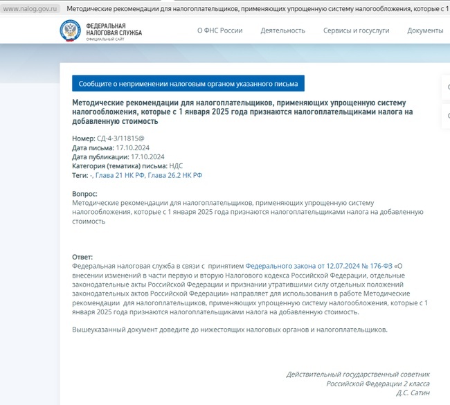 от 17. 10. 2024 № СД-4-3/11815@, в котором методично рекомендует, что делать УСН-щикам с НДС.