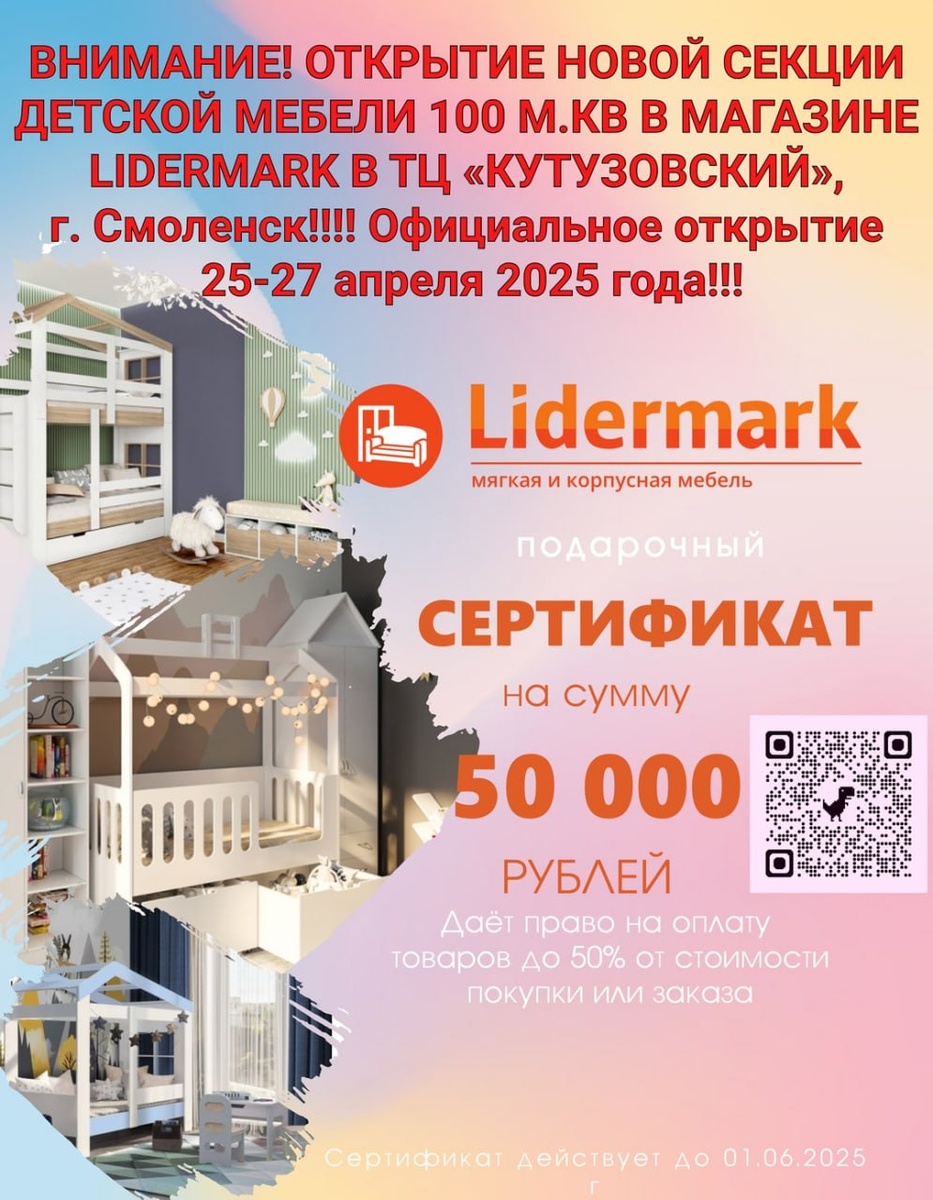 https://vk.com/wall-229534123_21 ВНИМАНИЕ! ОТКРЫТИЕ НОВЫХ СЕКЦИЙ ДЕТСКОЙ МЕБЕЛИ В САЛОНАХ LIDERMARK В ТЦ «КУТУЗОВСКИЙ» и ТЦ "Дом Мебели" Официальное открытие 25-27 апреля 2025 года!!! 26 апреля с 12 до 14 часов в ТЦ «КУТУЗОВСКИЙ» Вас ждут в гости Чебурашка и Шапокляк, эта знаменитая парочка поднимет настроение маленьким посетителям и поможет в выборе детской мебели мамам и папам! Приходите к нам в гости повеселиться и сфотографироваться! Сертификаты действительны во всех салонах "Lidermark" Все три дня в честь открытия всех посетителей ждёт ценный подарок от компании LIDERMARK! А всех покупателей все три дня ждут скидки до 50 % на заказ, подарок от производителя и бонус – бесплатное срочное изготовление – от 2 дней!!! Внимание! Между покупателями будет проводиться розыгрыш ортопедического матраса 1600х2000 / 1800х2000. Обязательное условие – быть подписанным на наше сообщество в ВК. Подробности у продавцов в салоне мебели и на странице сообщества в ВК! Получить скидку в дни открытия м