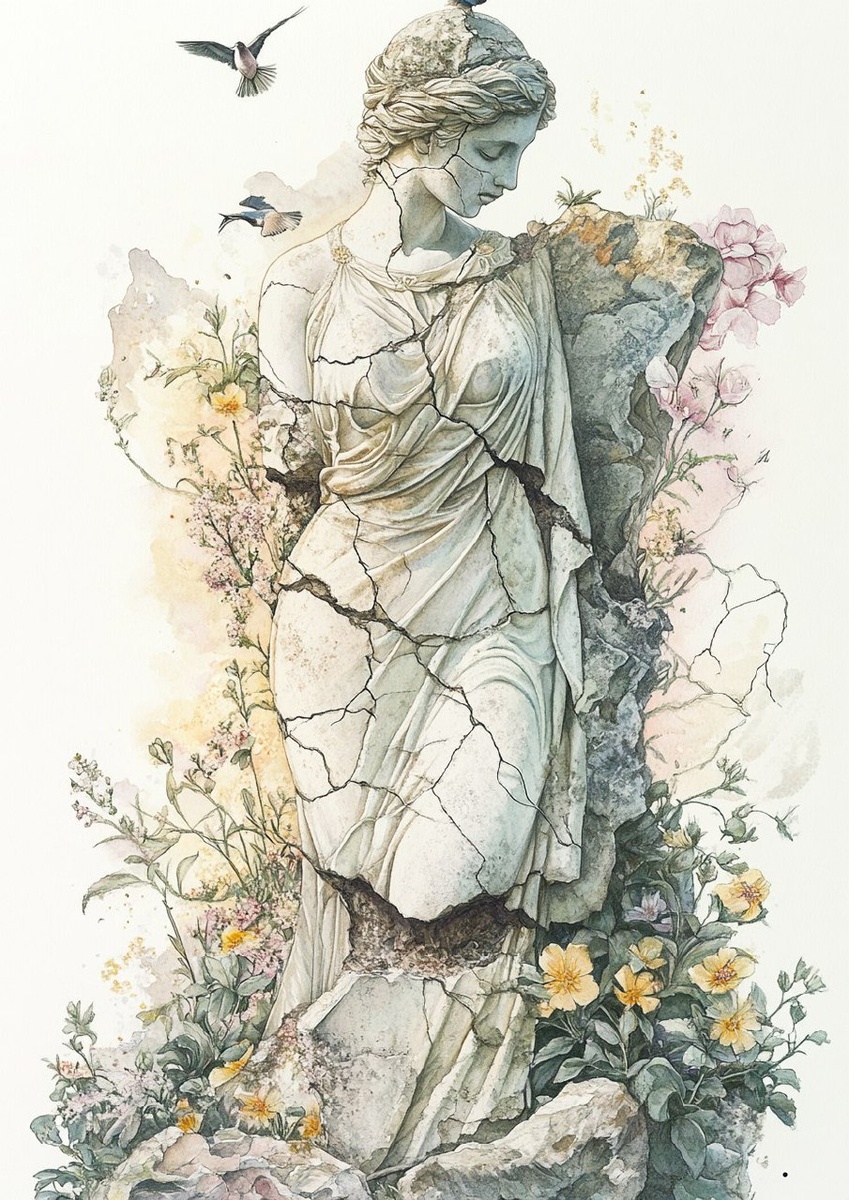 Создано на основе запроса: Watercolor and pencil illustration in the style of Marion Piret. A statue of a woman, full-length in the classical Greek style, the body with soft and graceful forms, life-size, which has cracks all over the body, crevices in the marble from which flowers sprout. The statue stands in a spring garden. Its surface is cracked and aged, but wild flowers and soft moss grow from the cracks. Her expression is serene, with closed eyes from which golden tears flow, full of peace and strength. Around her, birds perch gently and the wind blows through the flowers that grow from her. Illustration of an Oracle card. High quality, HD. --- Автоперевод: Акварельная и карандашная иллюстрация в стиле Марион Пирет. Отлично получилось? 🤔 https://dzen.ru/id/65c0c65c86e4f837c27b24d7 #ИИ #AI #нейросеть #midjourney #art