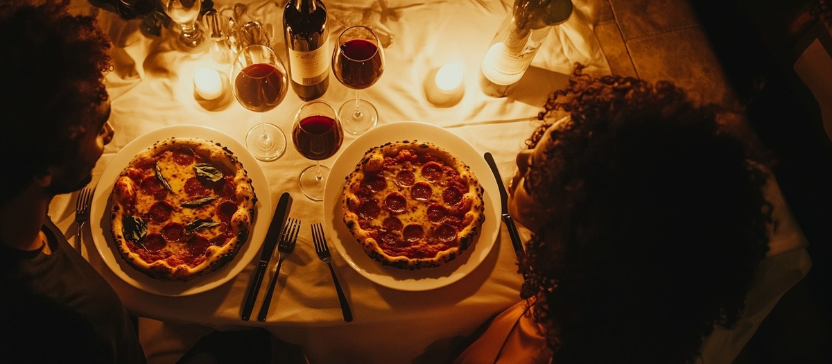 Создано на основе запроса: a high-angled shot of two people sat at a romantic table setting, dressed for date night, with two pizzas and