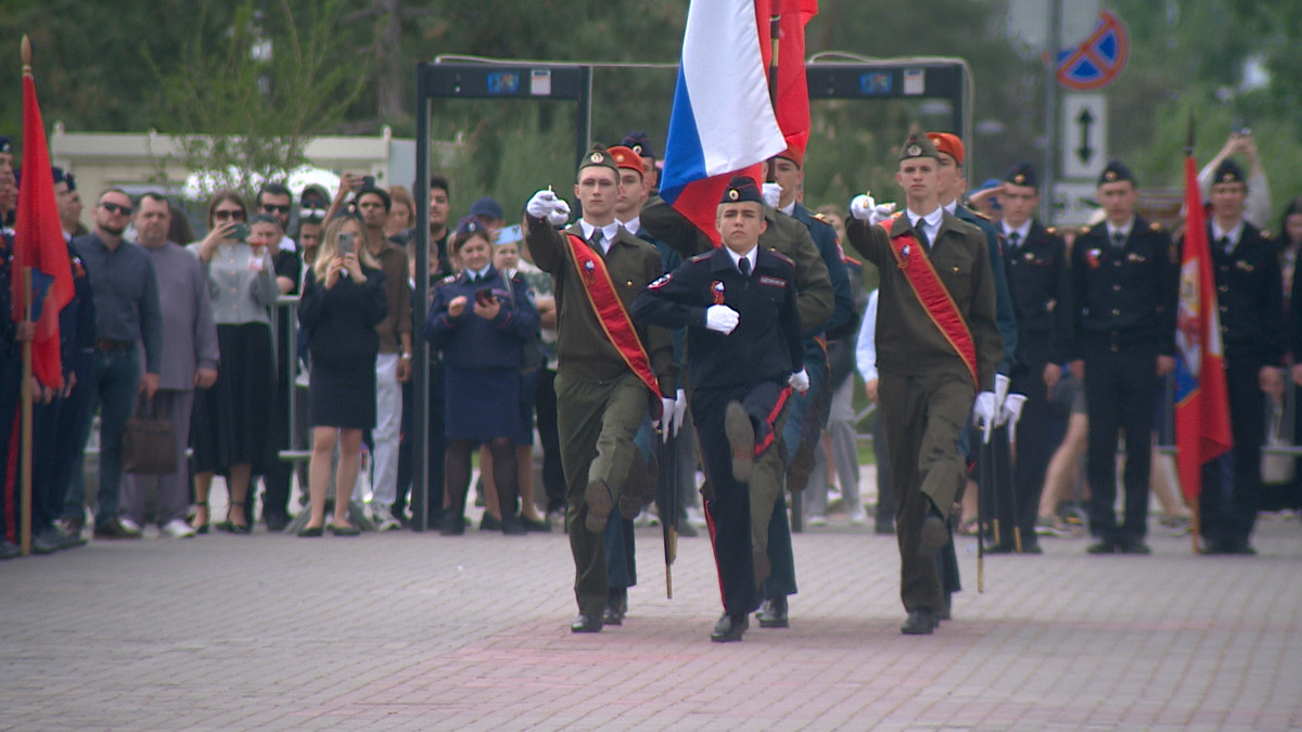 Парад Победы прошел сегодня в Волгограде, его участниками стали почти 1200 кадетов. Местом для проведения торжественного шествия стала площадка перед музеем-панорамой «Сталинградская битва». Волнение, чеканный шаг и трогательный вальс над Волгой – в репортаже волгоградских «Вестей». Этот день однозначно изменит каждого из них. Вчерашние дети – сегодня кадеты волгоградских школ равняются на знамя. Технику слаженной строевой оттачивали несколько недель. Под таким жарким волгоградским солнцем, но разве это важно, когда тебе доверено пройти на Параде Победы перед музеем-панорамой – главным хранителем свидетельств Сталинградского сражения? Под марши военных лет. «Для меня большая честь, что я родилась в Волгограде и что мне выпала такая возможность поучаствовать в этом параде. Когда надеваю форму, чувствую себя особенной. То, что я ношу погоны – это честь», – рассказывает ученица 7-го класса школы № 6 г. Волгограда. Николай Нарбеков возглавил знаменную группу. Ученик 8-го класса 101-й школы