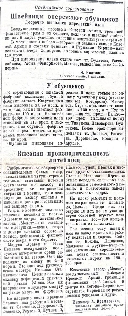 РИА «Карачаево-Черкесия» стало партнером просветительского проекта Дзен к 80-летию Великой Победы, в рамках которого будут опубликованы материалы, выходившие в газете «Красная Черкессия» (сегодня это «День республики») в 1945 году. Мы расскажем, чем жила Карачаево-Черкесия с 8 апреля по 13 мая 1945 года и как она встретила долгожданную Победу. Швейницы опережают обувщиков Воодушевленный победами Красной Армии, громящей фашистские орды в их берлоге, коллектив швейной фабрики им. 8 марта успешно завершил квартальную программу. В честь новой победы – вторжения славных воинов Красной Армии в столицу фашистской Германии Берлин – наш коллектив вчера, 24 апреля, выполнил апрельский план на 110%. При выполнении плана отличились товарищи Булатова, Рассыпайлова, Рябых, Фендрикова, Махова, выполнявшие по 2 – 2,5 нормы. У обувщиков В соревновании с швейной фабрикой коллектив обувной фабрики отстает. Квартальный план выполнен на 99%, в то время как на швейной фабрике на 105%. На швейной фабрике ап