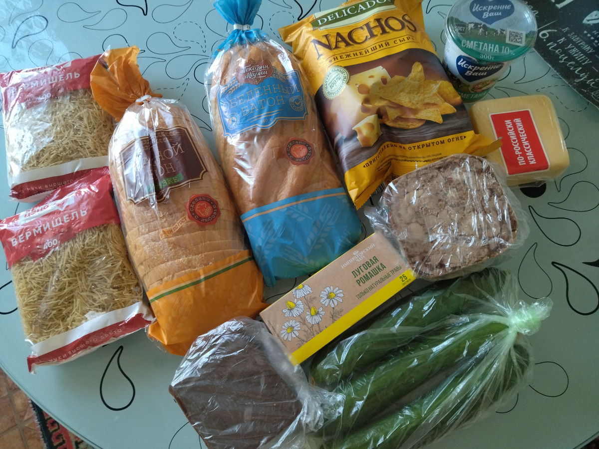 Ну, в общем-то я определилась. Продолжу свой несостоявшийся марафон и до конца месяца снова буду жить семьей на определенную сумму. Пусть снова будет 156 рублей на человека в день, то есть всего до конца месяца 4368 рублей на всех. Сумма небольшая, но и времени не так много. Надеюсь, что справлюсь. Сегодня совершила набег на магазины. Два батона, огурцы, печеночный хлеб, сметана, сыр, ромашка, шоколадное масло. Чипсы захотелось, покупаем очень редко, поэтому иногда можно себе позволить "потравиться". За кадром еще листовой салат в горшочке. Из заложенных денег осталось 3396 рублей. По еде - ничего не готовила сегодня, утром проинспектировала холодильник и решила, что перебьемся. На завтрак доедали творожную Пасху, пили чай/кофе с бутербродами с колбасой и куличом. На обед суп куриный с вермишелью, фото не сделала. На ужин рис и куриные бёдра. В общем, все сыты и довольны. Едем дальше)