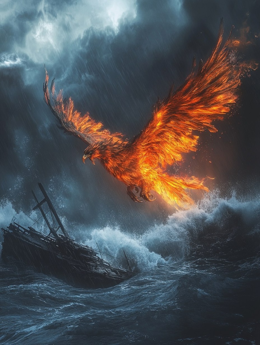 Создано на основе запроса: Hydro spectral liquid waterdripping Phoenix rising from the sea in an epic tempest in front of a shipwreck