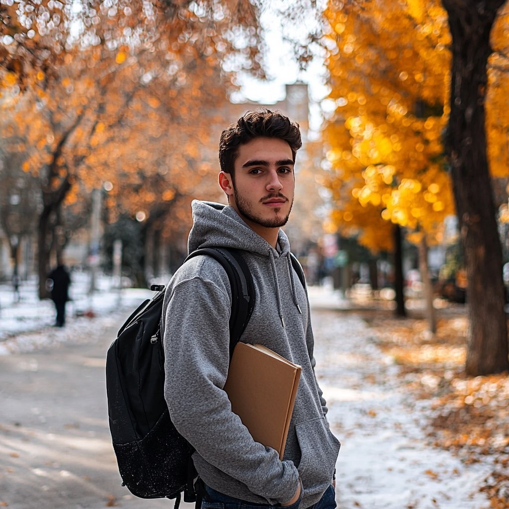 Создано на основе запроса: A hyper-realistic square image (1:1 aspect ratio) of a young male student with Argentine or Latin features, wearing a hoodie and jeans, standing on a Canadian campus or urban street with fall trees or a snowy sidewalk in the background. He is holding a book or backpack, looking slightly to the side with a confident, calm expression. The scene has crisp natural lighting, visible breath if cold, and cinematic tones, reflecting academic life abroad. --- Автоперевод: Гиперреалистичный квадратный изображение (соотношение сторон 1: 1) молодого студента-мужчины с аргентинскими или латинскими чертами, в капюшоне и джинсах, стоящих в канадском кампусе или городской улице с осенними деревьями или снежным тротуаром на заднем плане. Как тебе генерация? 🤔 https://dzen.ru/id/65c0c65c86e4f837c27b24d7 #ИИ #AI #нейросеть #midjourney #art