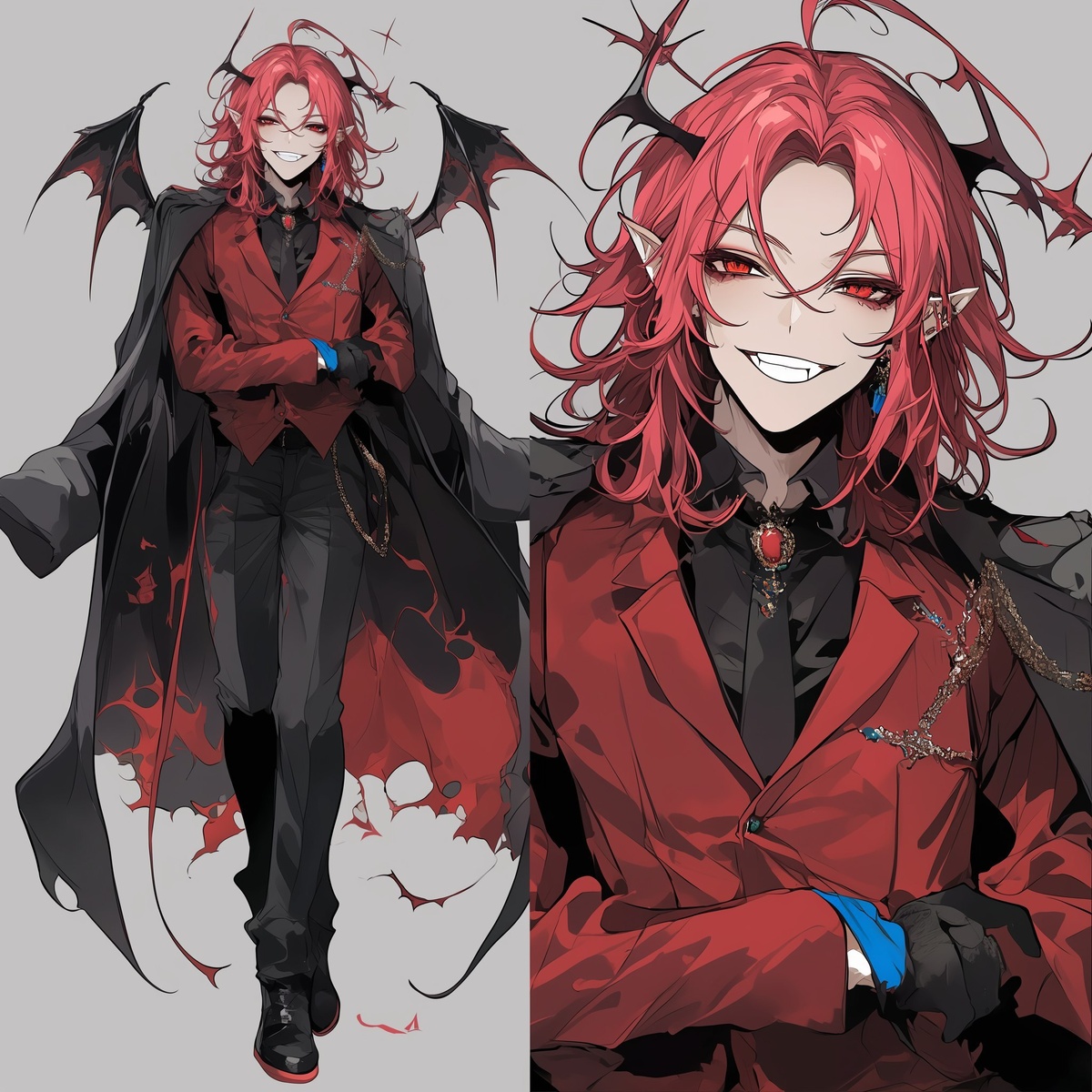 Создано на основе запроса: Full-length vampire guy with pink hair and scarlet eyes in a luxurious bright suit