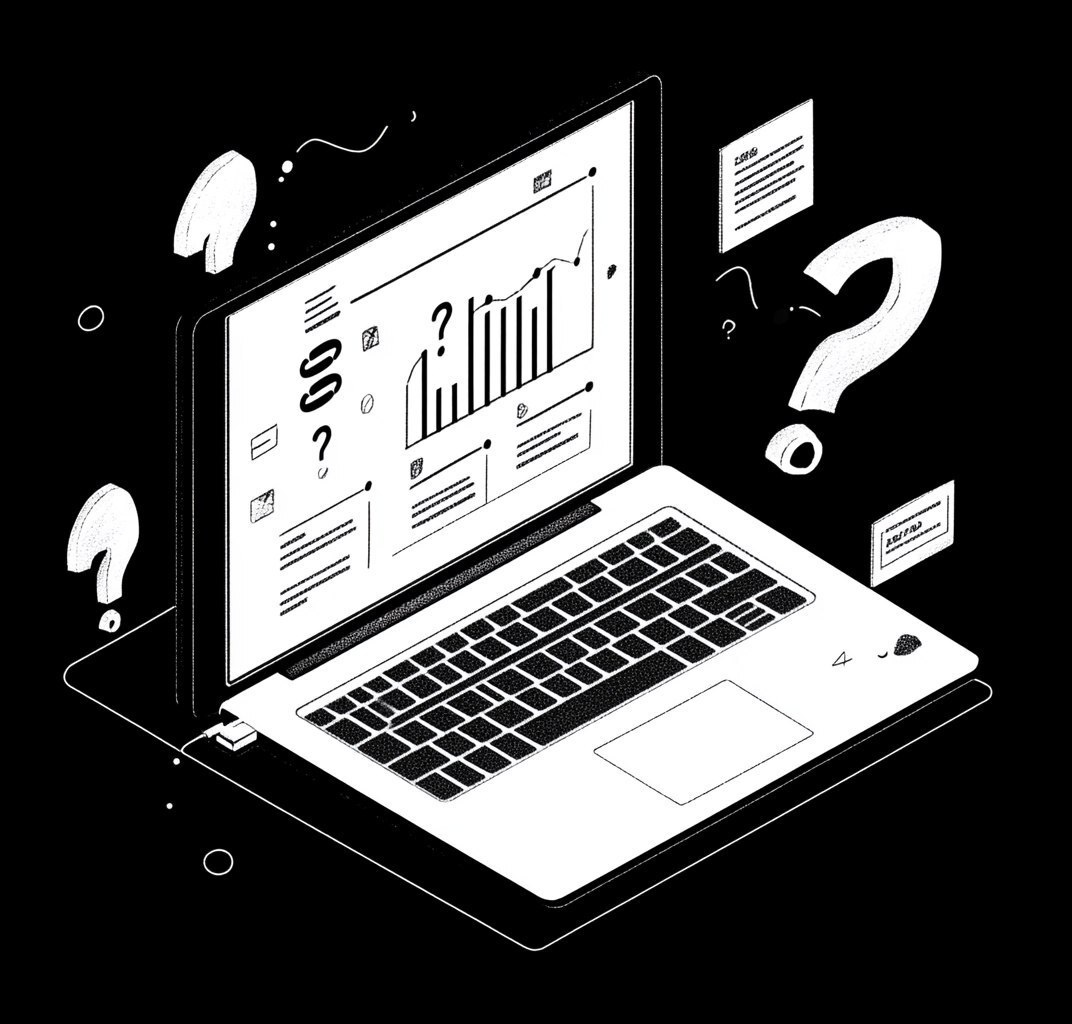 Создано на основе запроса: a black and white minimalist illustration of a laptop screen displaying a table of values, with question marks and explanatory text annotations around the table, clean grid layout, conceptual design, abstract visual cues of analysis and confusion, high contrast, digital workspace aesthetic, monochrome
