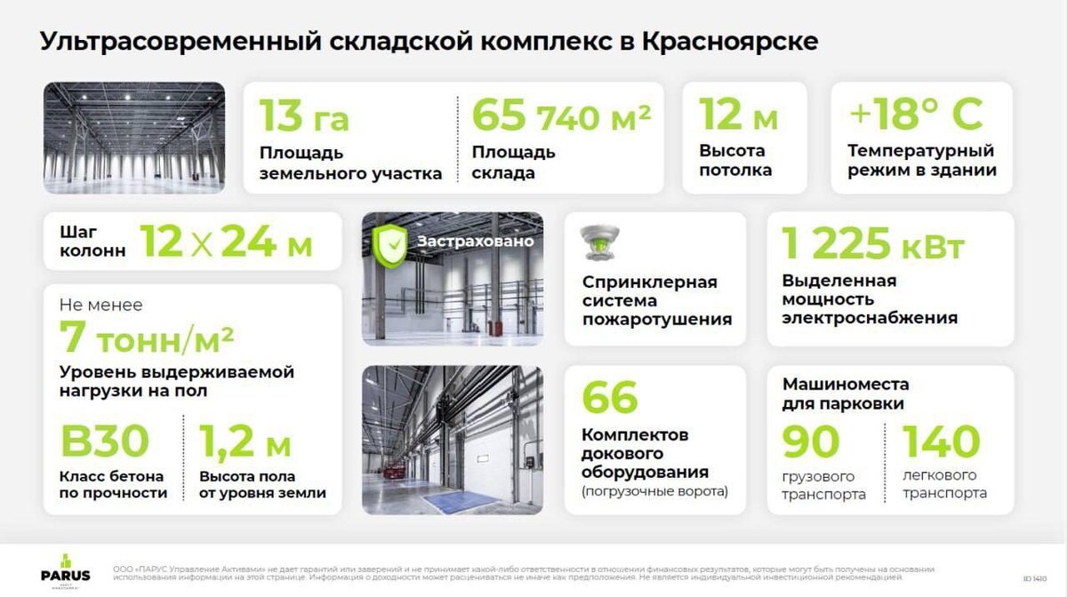 Парус: новый фонд Парус выпускает новый фонд, теперь в Красноярске. Что за объект: Это склад под Красноярском на 65740 квадратных метров только что введенный в эксплуатацию, ультрасовременный и технологичный с заполненостью 100%; С удобной локацией - 20 минут до центра Красноярска и 100 метров до федеральной трассы Сибирь. Тут два якорных арендатора: 1 этаж занимает Сбер Логистика 2 этаж занимает Озон Это длинные контракты с индексацией арендных цен на инфляцию. Таких активов мало, учитывая что потребность в складских мощностях все время растет - это ликвидный актив на который есть спрос. Сколько можно заработать? Доход складывается из двух вещей: 1)Рентные платежи 12% ДД за 2025, постепенно она будет расти и превысит 13% в 2029. Индексируется на инфляцию, если будет больше 4% - будет выше. 2)Рост стоимости пая. Базово, недвижимость растет на стоимость инфляции, но в какие-то моменты может быть резкая переоценка (например, при снижении ставки). Базово, ждут 10% в ближайшие 5 лет.