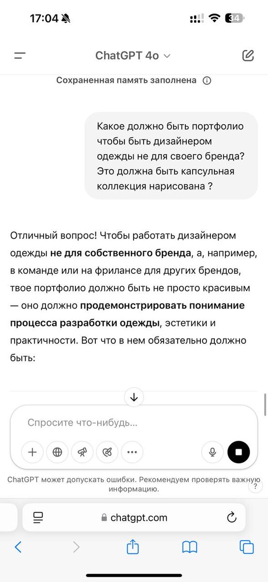 Когда меня спрашивают, что должно быть в портфолио, чтобы работать с дизайнером одежды, я иду проверять себя… в ChatGPT