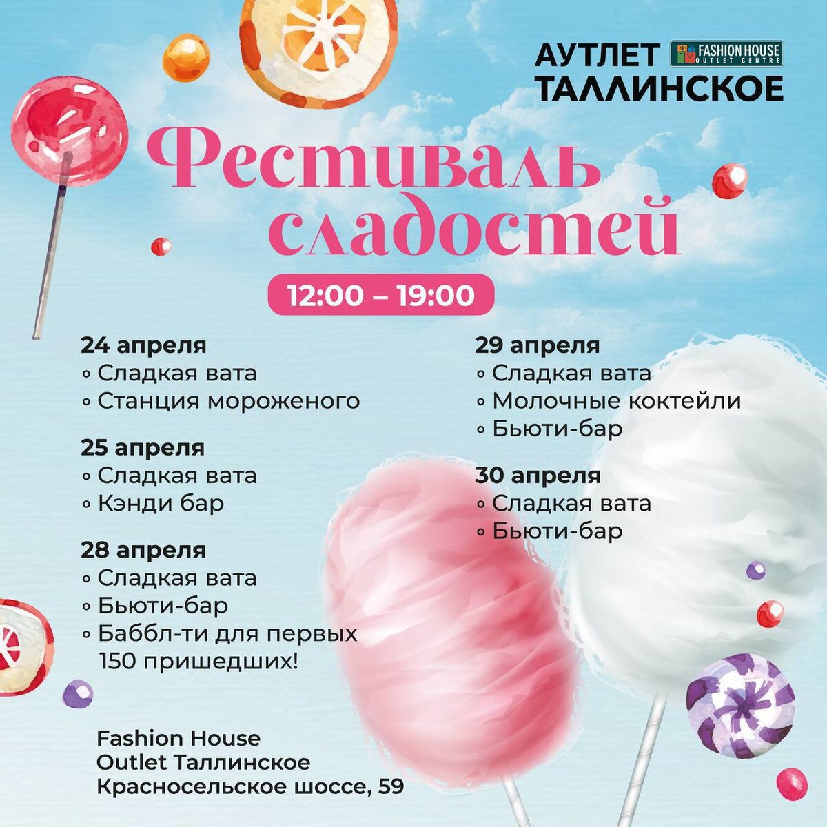 СЛАДКИЕ НОВОСТИ от Аутлета Таллинское! 🍭 Уже сегодня у них стартует — Фестиваль Сладостей! С 24 по 30 апреля, с 12:00 до 19:00, вас ждут самые вкусные дни этой весны! Готовы к сладкому взрыву? 💥 🍬 Сладкая вата 🍦 Мороженое 🎁 Кэнди-бар с любимыми конфетами 💄 Бьюти-бар для сладких преображений 🥤 Молочные коктейли и бабл-ти (для первых 150 гостей в один из дней!) И знаете, что самое главное? Все это это абсолютно БЕСПЛАТНО! 📍 *Адрес:* Fashion House Outlet Таллинское, Красносельское шоссе, 59 Самые сладкие покупки ждут вас 🍫 Реклама. ООО «Фэшн Хаус СПб» ИНН 7842459430 erid: 2VtzqvvLQmp